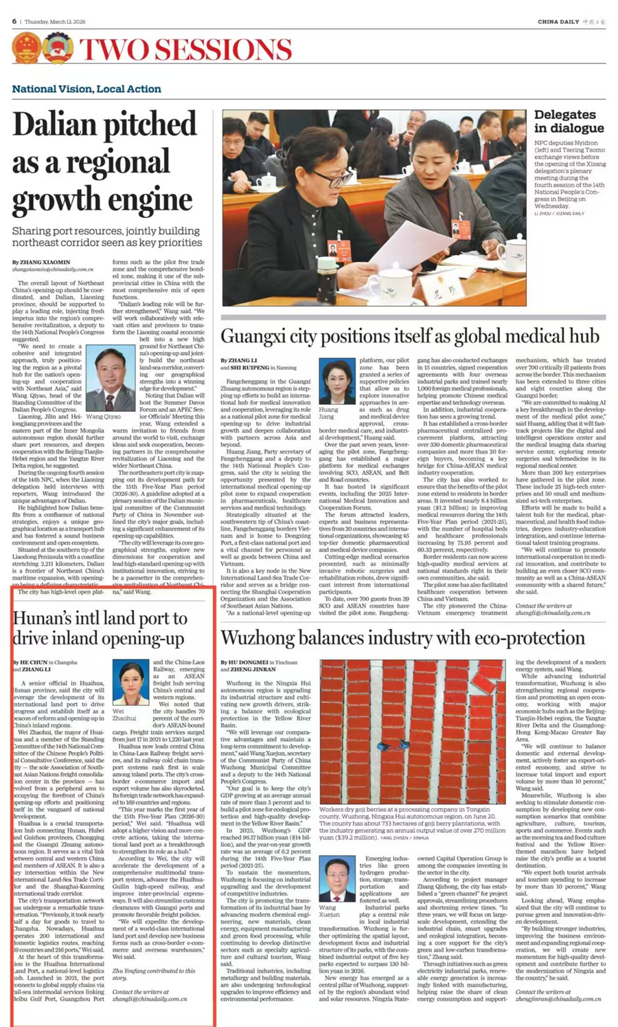 編者按:《中國日報(bào)》“中國式現(xiàn)代化的地方實(shí)踐”(National Vision, Local Action)高端訪談欄目,講述中國式現(xiàn)代化建設(shè)道路上的地方特色實(shí)踐。3月12日,《中國日報(bào)》兩會專版刊發(fā)全國政協(xié)常委,懷化市委副書記、市長韋朝暉專訪文章《Huaihua: Forging a New Highland for High-Level Opening-Up in Inland China(以國際陸港建設(shè)為引擎 奮力打造內(nèi)陸地區(qū)改革開放高地標(biāo)志性工程)》。