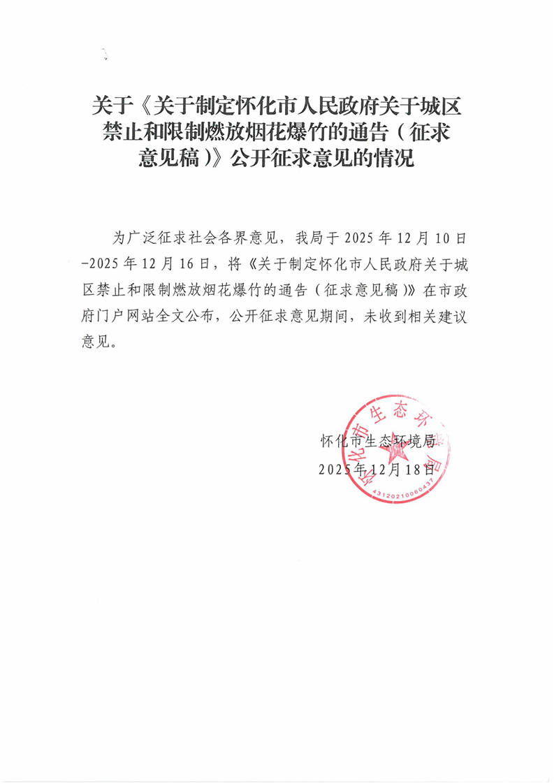 關(guān)于《關(guān)于城區(qū)禁止和限制燃放煙花爆竹的通告(征求意見稿)》公開征求意見的情況