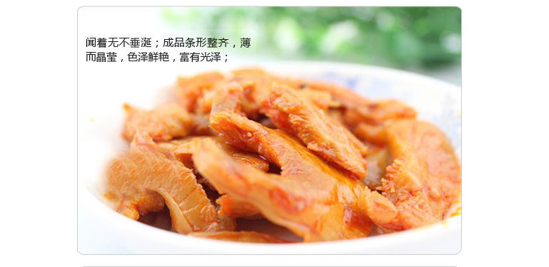 品牌: 富橋牛肉 包裝方式: 袋裝 保質(zhì)期: 365天 凈重: 118g 生產(chǎn)許可證: QS431204011741 產(chǎn)品標準號: DB43/160.2-2009 配料表: 牛肚、香精、食用鹽等 儲藏方法: 密封,陰涼儲藏 是否含糖: 含糖 產(chǎn)地: 湖南省 懷化市 新晃侗族自治縣 |