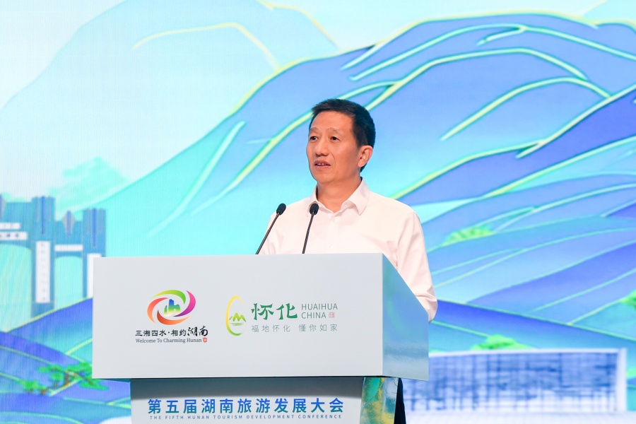 ▲9月17日上午,第五屆湖南旅游發(fā)展大會(huì)開幕,市委書記許忠建作懷化文化旅游推介。(懷化日?qǐng)?bào)全媒體記者 楊智偉 攝)