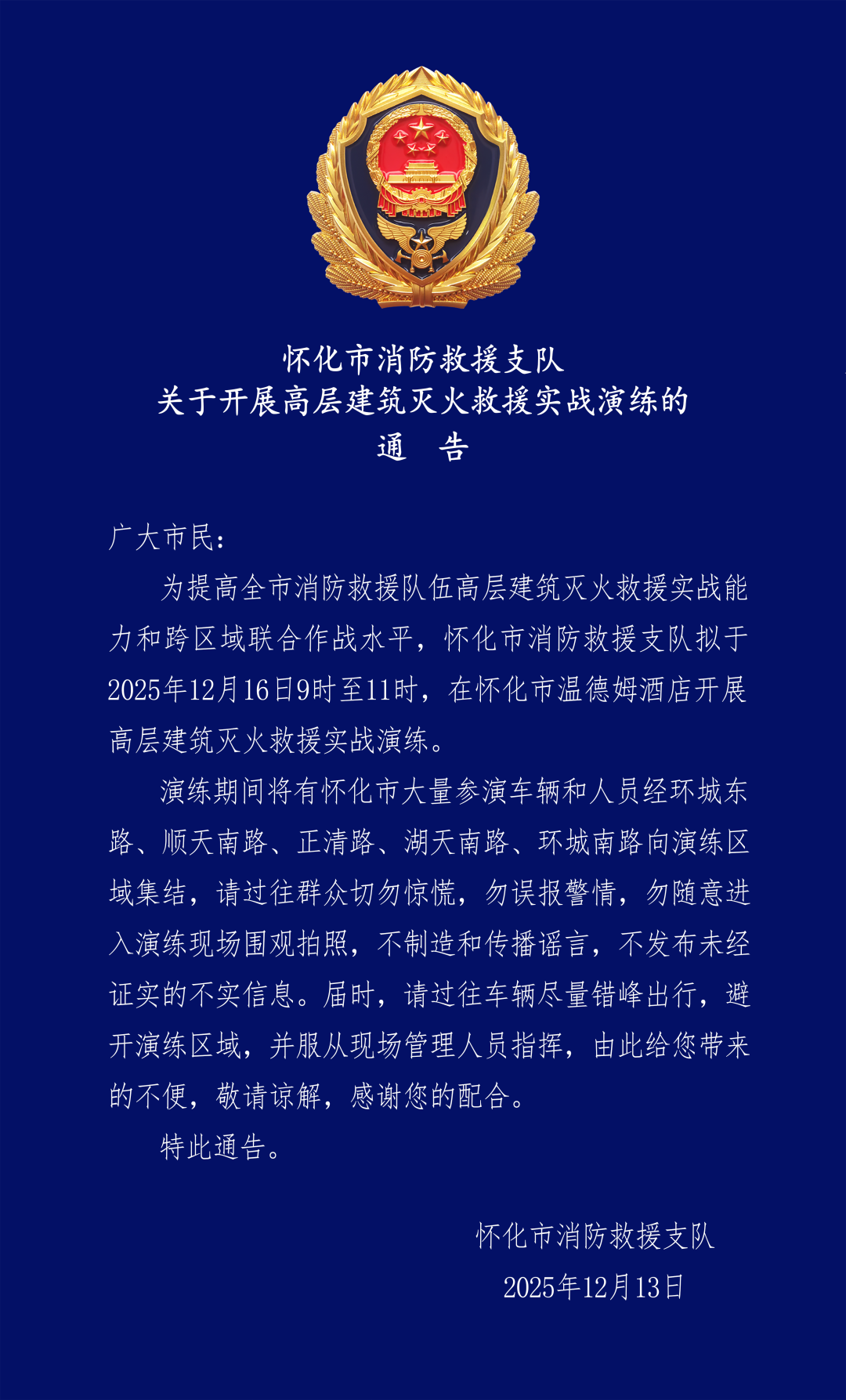 懷化市消防救援支隊(duì)關(guān)于開(kāi)展高層建筑滅火救援實(shí)戰(zhàn)演練的通告