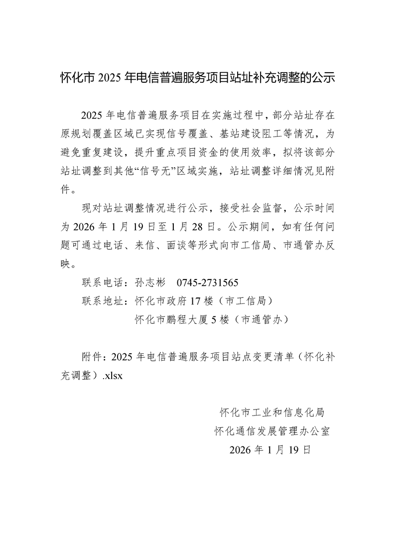 懷化市2025年電信普遍服務項目站址補充調(diào)整的公示