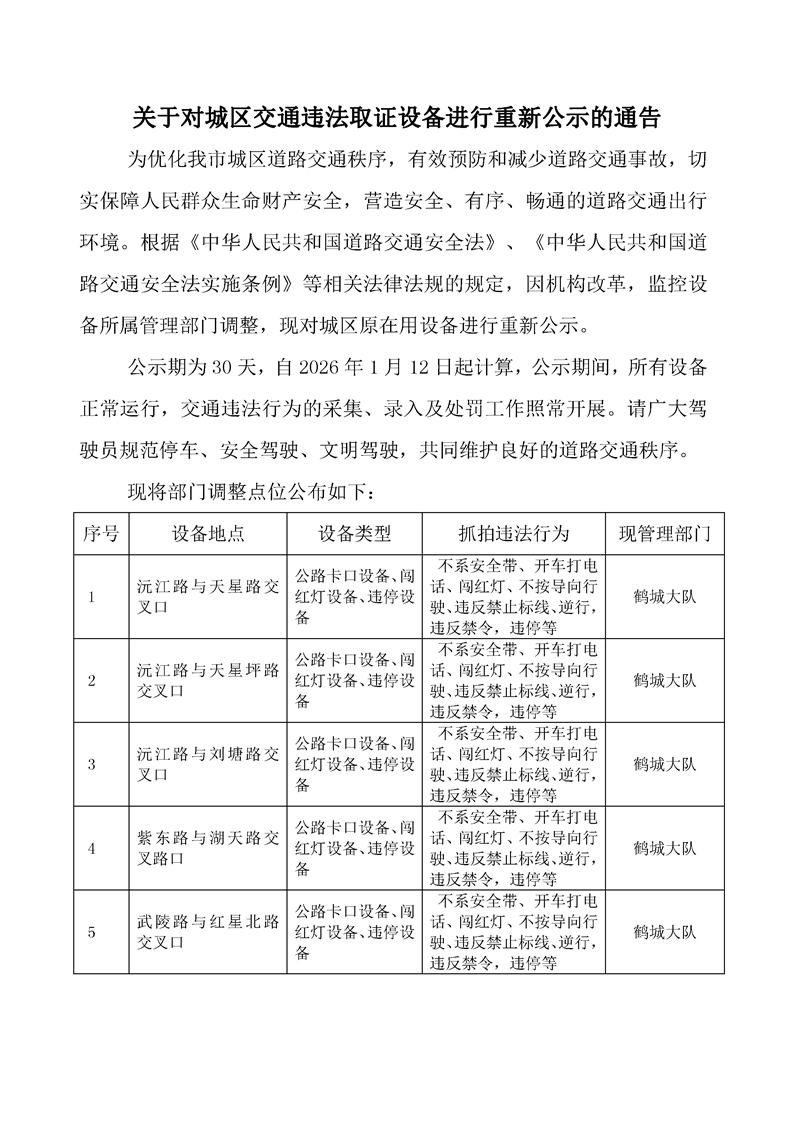 關(guān)于對城區(qū)交通違法取證設(shè)備進行重新公示的通告