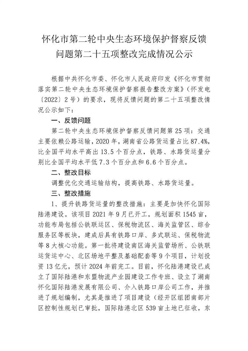 懷化市第二輪中央生態(tài)環(huán)境保護督察反饋問題第二十五項整改完成情況公示