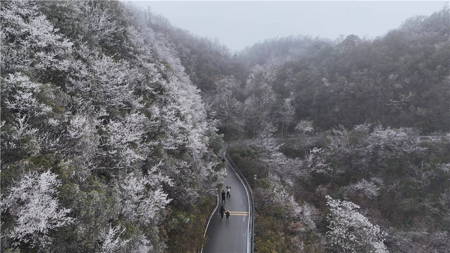 與此同時,洪江市雪峰山區(qū)域亦迎來今冬首場大規(guī)模霧凇。持續(xù)低溫與充沛水汽交織,使山體海拔較高處形成大面積“玉樹瓊花”景觀。