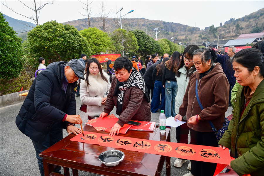 1月18日上午,“翰墨飄香迎新春 春聯(lián)福字送萬家”寫春聯(lián)送祝?;顒?dòng)在鶴城區(qū)黃巖旅游度假區(qū)舉行。書法家揮毫潑墨,游客即興創(chuàng)作,紅聯(lián)映云海,福字暖人心,山間年味滿溢。(懷化日?qǐng)?bào)全媒體記者 潘雨 攝)