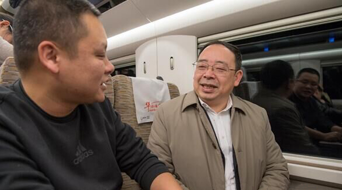 1月11日,省人大代表鐘果林在高鐵上接受懷化日?qǐng)?bào)記者的采訪。(記者 潘雨 攝)