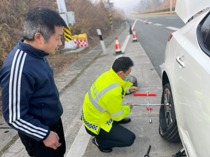 春運(yùn)第一天,高速公路上車(chē)流量明顯增加,懷化西管理所巡查人員江揚(yáng)、于楓起了個(gè)大早,開(kāi)始了一天的巡查工作。9時(shí)許,巡查至G65包茂高速懷化段K2187南往北時(shí),發(fā)現(xiàn)一輛小車(chē)因右后輪爆胎停在緊急停車(chē)帶。由于駕駛員沒(méi)有換胎經(jīng)驗(yàn),正焦急地站在車(chē)旁,手足無(wú)措。巡查人員了解情況后,立即用隨車(chē)維修工具幫助司機(jī)更換輪胎,不到5分鐘就將備胎換上,幫助駕駛員再次踏上旅途。