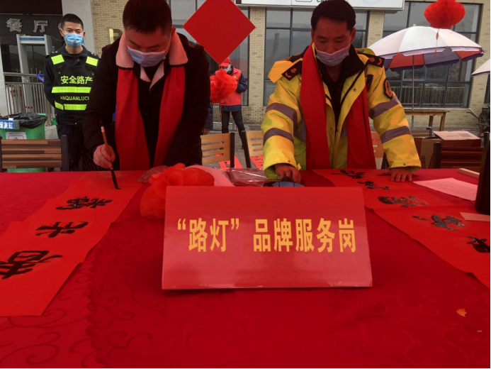 冬日暖陽,春節(jié)腳步臨近。1月11日,在G65包茂高速公路洪江服務區(qū)內(nèi),繁忙而有序。在服務區(qū)一側(cè),懷化分公司的“路燈”志愿者正在現(xiàn)場揮毫潑墨、寫福送春聯(lián),洋溢著濃濃的喜慶氛圍。活動現(xiàn)場引來許多司乘朋友圍觀,有的直接挑選已經(jīng)寫好的“成品”,有的則根據(jù)自己的需要邀請志愿者為他們“量身定制”。一幅幅紅春聯(lián)和金燦燦的“福”字滿載著新春祝福,傳遞著濃濃溫情。