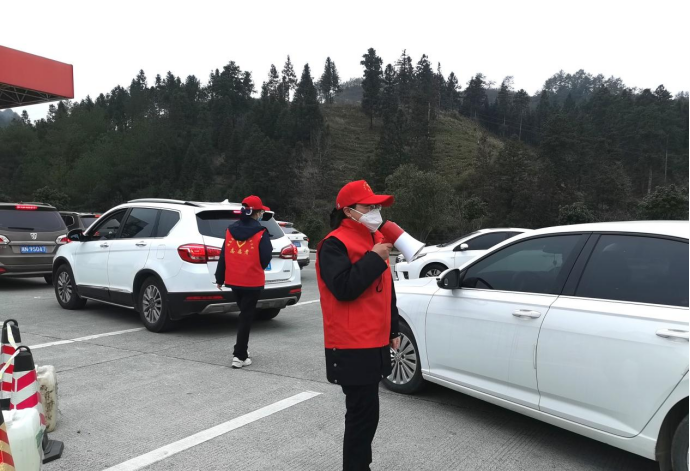 (“路燈”志愿者在通道服務(wù)區(qū)加油站引導車輛有序通行。)
