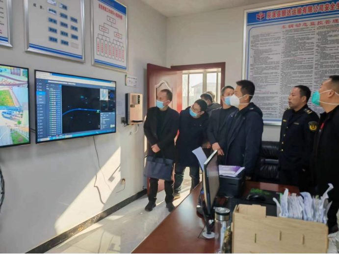 副縣長舒斌(右三)在順達(dá)危貨公司通過監(jiān)控平臺抽查危貨車輛安全運(yùn)營情況