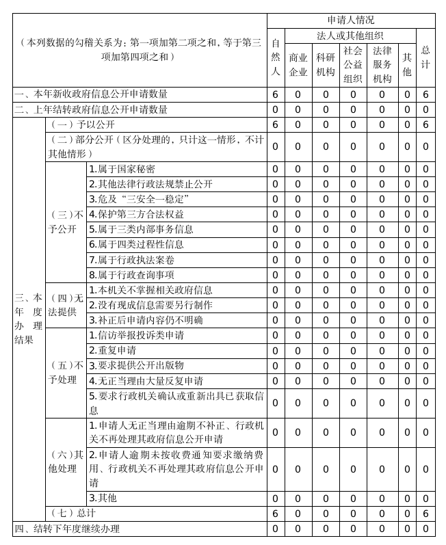 全年收到6件信息公開申請,均已按時辦結。在行政復議、訴訟方面,也未收到有關政府信息公開的行政復議申請,也未發(fā)生關于政府信息公開的行政訴訟案件。