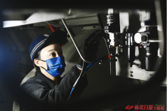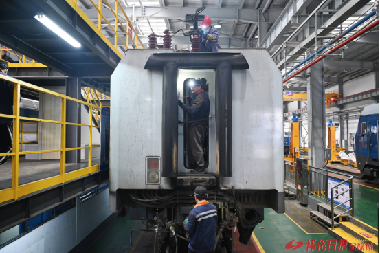 (1月13日,在懷化機務(wù)段檢修庫內(nèi),3名工作人員位于車上、車中、車下位置同步檢修HXD1型電力機車。)