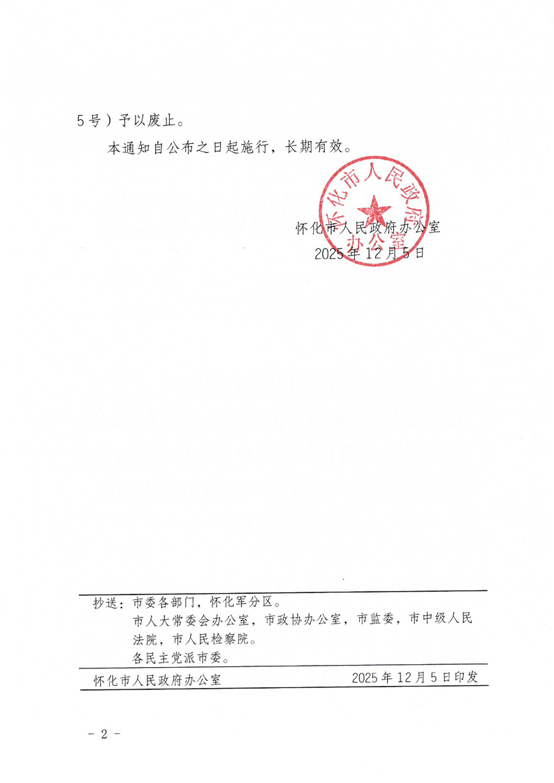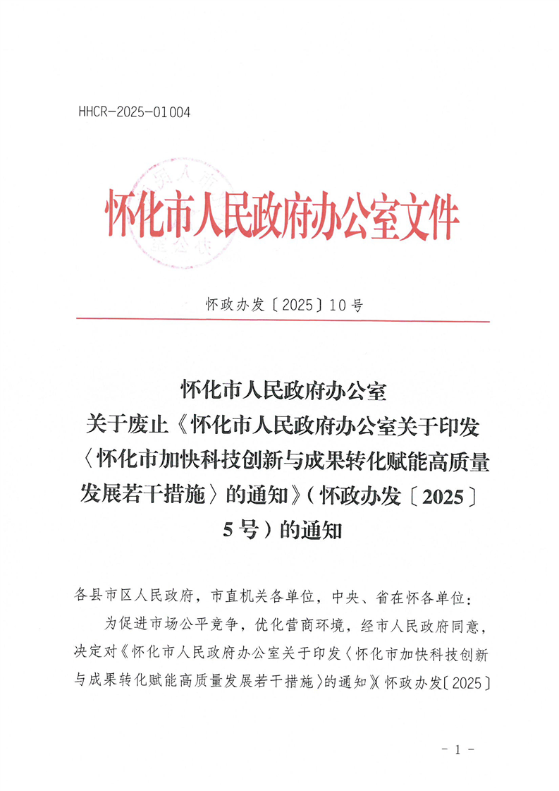 懷化市人民政府辦公室關(guān)于廢止《懷化市人民政府辦公室關(guān)于印發(fā)〈懷化市加快科技創(chuàng)新與成果轉(zhuǎn)化賦能高質(zhì)量發(fā)展若干措施〉的通知》(懷政辦發(fā)〔2025〕5號(hào))的通知