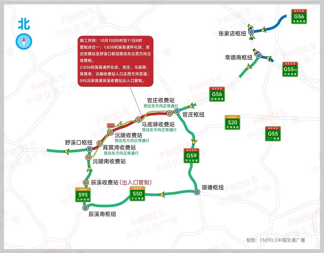2.G56杭瑞高速懷化段,官莊、馬底驛、筲箕灣、沅陵收費站入口往西方向匝道;S95沅辰高速辰溪收費站出入口管制。